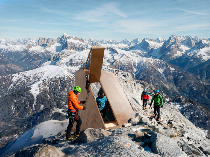 Це – автономний дерев’яний бівуак, створений із перехресно-ламінованої деревини (CLT), який спершу буде встановлено у Мілані як міський павільйон, а згодом – розібрано, перевезено гелікоптером і встановлено високо в Альпах як постійний гірський притулок.