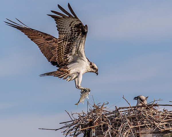 Скопа – це унікальний хижак, що спеціалізується на риболовлі. Її силует легко впізнати за розмахом крил до 170 см і характерною формою польоту у вигляді літери «М». Цей великий птах має білі груди, темну «маску» на голові й дивовижну здатність пірнати у воду з висоти, щоб упіймати здобич.