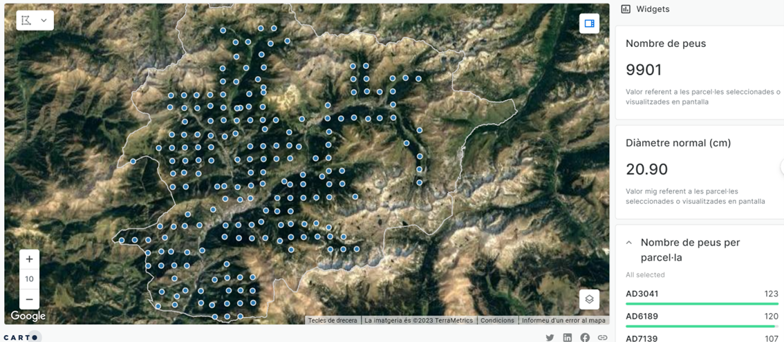 Доступ до бази даних BD-INF1-AND дозволяє вивчення інформації, зібраної на 194 ділянках під час польових робіт у 2022 році. Andorra Research + Innovation також забезпечує громадськість інструментом просторової візуалізації для інтерактивного дослідження даних, включаючи інформацію про понад 9000 виміряних дерев.