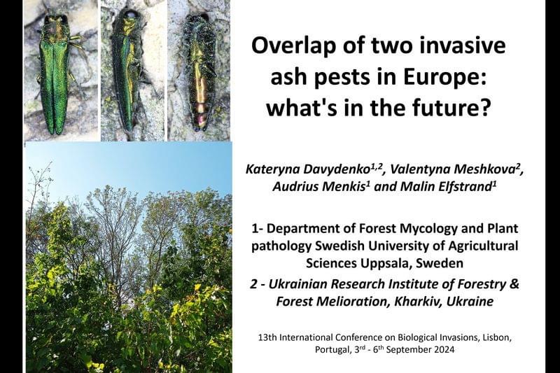 Катерина Давиденко (УкрНДІЛГА) презентувала дослідження щодо вторгнення ясеневої смарагдової вузькотілої златки в Україну та особливості моніторингу її поширення. Вона повідомила, що два інвазійних шкідники азійського походження – збудник халарового некрозу та ясенева смарагдова вузькотіла златка – нині знищують ясеневі насадження України та загрожують існуванню цього виду в Європі. Було висвітлено методи ідентифікації інвазійних шкідників і перспективи пошуку резистентних генотипів ясена в Європі для збереження популяції Fraxinus excelsior і видів, які з ним асоційовані.
